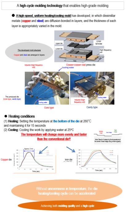 ・To obtain an automotive part using thermoplastic CFRP, the company is working to develop a heat press molding technology that enables cost reduction at a higher cycle than the conventional thermosetting CFRP autoclave molding. In this effort, the company has developed a technology for accelerating the die heating/cooling cycle without unevenness in temperature during molding.