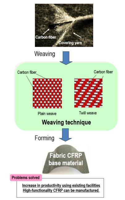 By covering carbon fibers, a general-purpose weaving machine can be used for weaving into fabric.