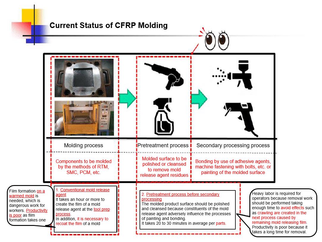 3) Cure processing of mold releasing films at tool prep process is not neccessary , and easy to start molding by applying release agent to the mold by spray or wiping.