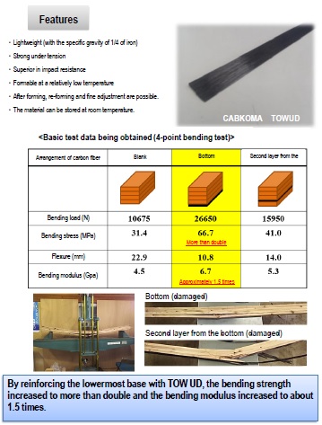 Unidirectional carbon fiber sheet using thermoplastic resin. By integrating this carbon fiber with laminated timber, a new laminated timber,which is thinner, lighter, and stronger than an ordinary laminated timber was developed. Domestically produced Japanese cedar timberespecially is low in strength, and its use as structural material is limited. By combining cedar timber with carbon fiber, the strength is increasedand it is expected that the usage amount of domestic timbers as structural materials is increased, resulting in a contribution to promotion of theforestry industry.