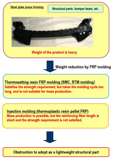 Our company has established a molding technology for thermoplastic resin composite material with excellent productivity and realized stable high-speed molding in order to overcome this issue.