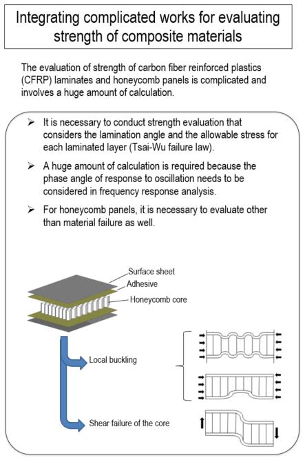 In addition to isotropic materials such as metals, the company efficiently evaluates strengths of anisotropic materials, their laminates and honeycomb panels (sandwich structure consisting of a honeycomb core and thin sheets on both surfaces), with its experience in composite design based on space development.