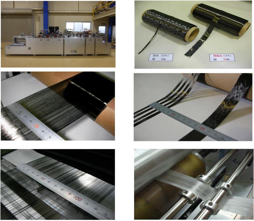 As a conventional general fiber spreading technology, it is a method of rubbing with a roll bar. But there is a limit on the fiber spreading magnification, actual spreading magnification is about 2 times maximum. Also rubbing makes some damage to the fiber.