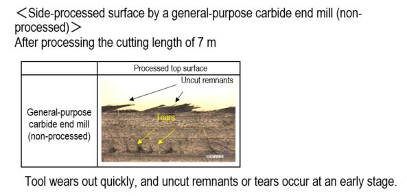 ・When a dull cutting tool is used, laminated carbon fibers are not cut, and interlaminar delamination or uncut remnant occurs, resulting in defect in quality.