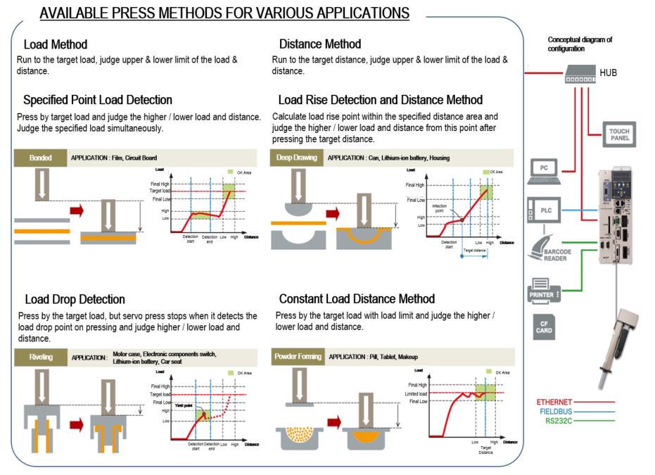 ・Using electric servo press for pressing system enables load control, distance control, and pressing judgment.