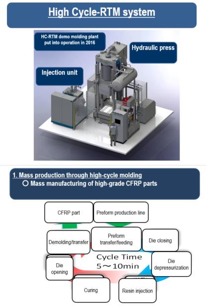 Mass production of a high-grade CFRP product through 5-to-10 minute high-cycle RTM molding