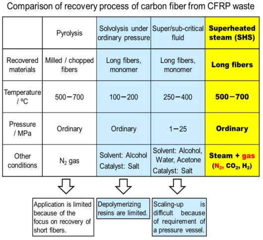 ・Matrix resin of CFRP is decomposed and vaporized by superheated steam treatment, and various lengths and states of carbon fibers can be recovered.