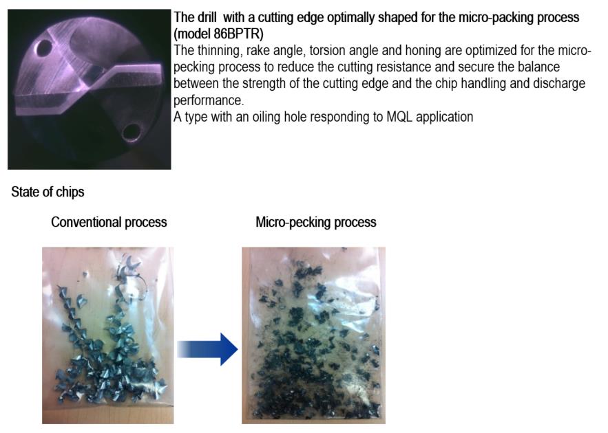 By adopting the micro-pecking process and a drill with a cutting edge optimally shaped for it to the drilling of a laminated sheet of CFRP and Ti alloy, it became possible to process the workpiece in a single step, and various effects were achieved.