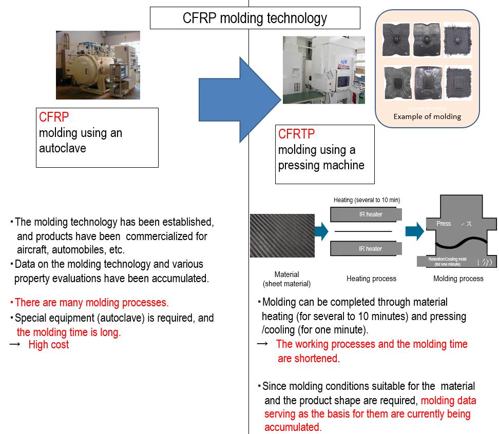 ・Basic data on methods for molding (press molding) CFRTP in a 3D shape in place of the conventional CFRTS (autoclave molding), setting conditions and molding evaluation method have been accumulated.